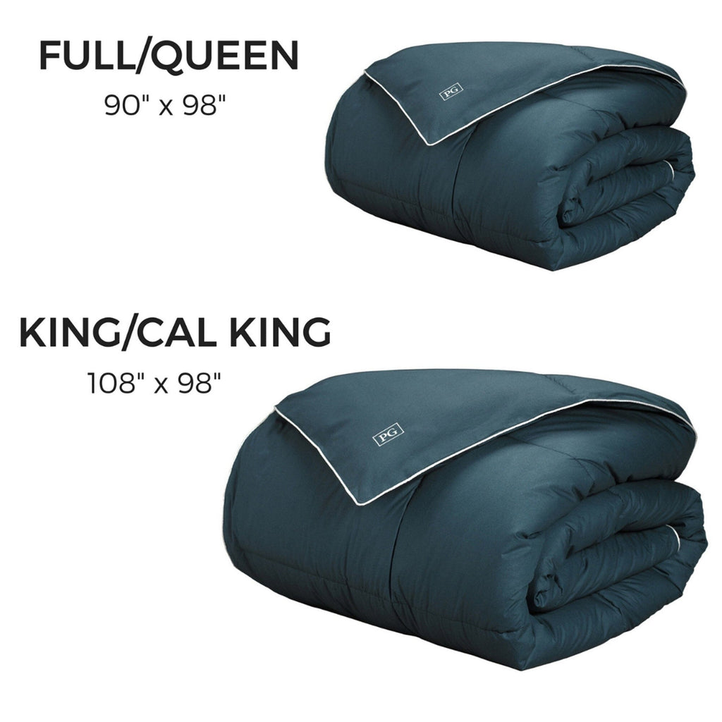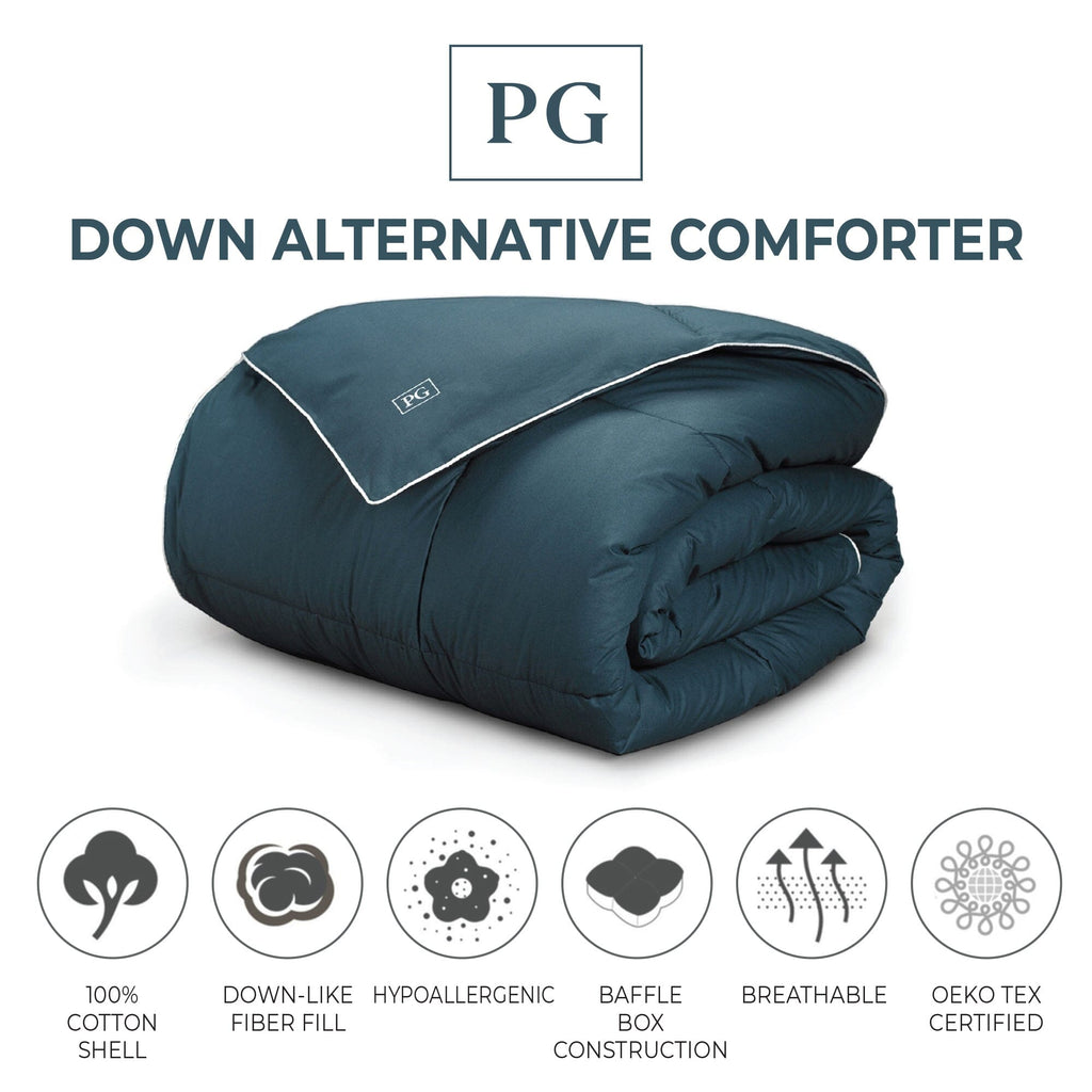 Our Pillow Guy Down-Alternative Comforter is going to be the last comforter you ever need!  The 280 thread count, 100% cotton shell is generously filled with our naturally hypoallergenic fiber that mimics the support and feel of down.  It has a sewn through box construction ensuring that the fiber will remain balanced even as you move during the night.  It is dyed in our stylish Pillow Guy Blue and accented with a white satin welt cord and PG logo.